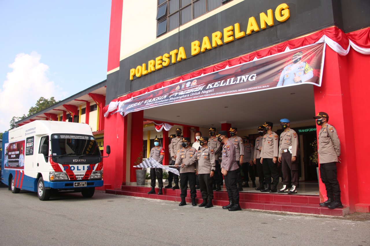 LANCANGKUNINGNEWS, Batam — Kapolresta Barelang Kombes Pol Yos Guntur, SIK di dampingi Wakapolresta Barelang AKBP Junoto, SIK, Kasat Lantas Polresta Barelang Kompol Krisna Ramadhani Yal, SIK Melaunching Gerai Vaksin Presisi Keliling atau Gerai Vaksin Mobile di PT Flex Batamindo Park, Kamis (8/7/2021).