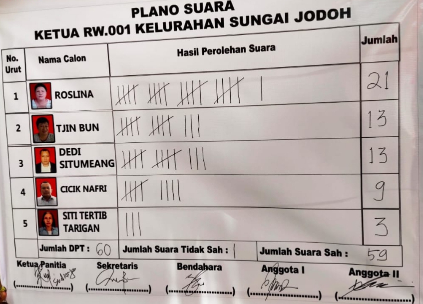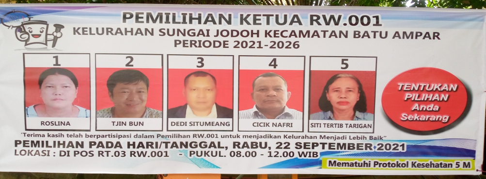 LANCANGKUNINGNEWS.Com. Batam 22/09/2021 Kelurahan Sungai Jodoh Mengadakan pemilihan Ketua Rukun Warga (RW) yang di ikuti oleh 5 nama kandidat dari masing-masing Rukun tetangga (RT), diantaranya Roslina,Tjin Bun, Dedi Situmeang, Cicik Nafri,Siti Tertib Tarigan. Dalam pemilihan itu ditetapkan Ibu Roslina menjadi Ketua RW 003 dengan perolehan suara terbanyak , dari 60 surat suara dalam daftar pemilih tetap di Rt003/RW 001 yang berlangsung di komplek Bumi ayu lestari Kelurahan Sungai Jodoh kecamatan Batu Ampar Kota Batam kepulauan Riau.