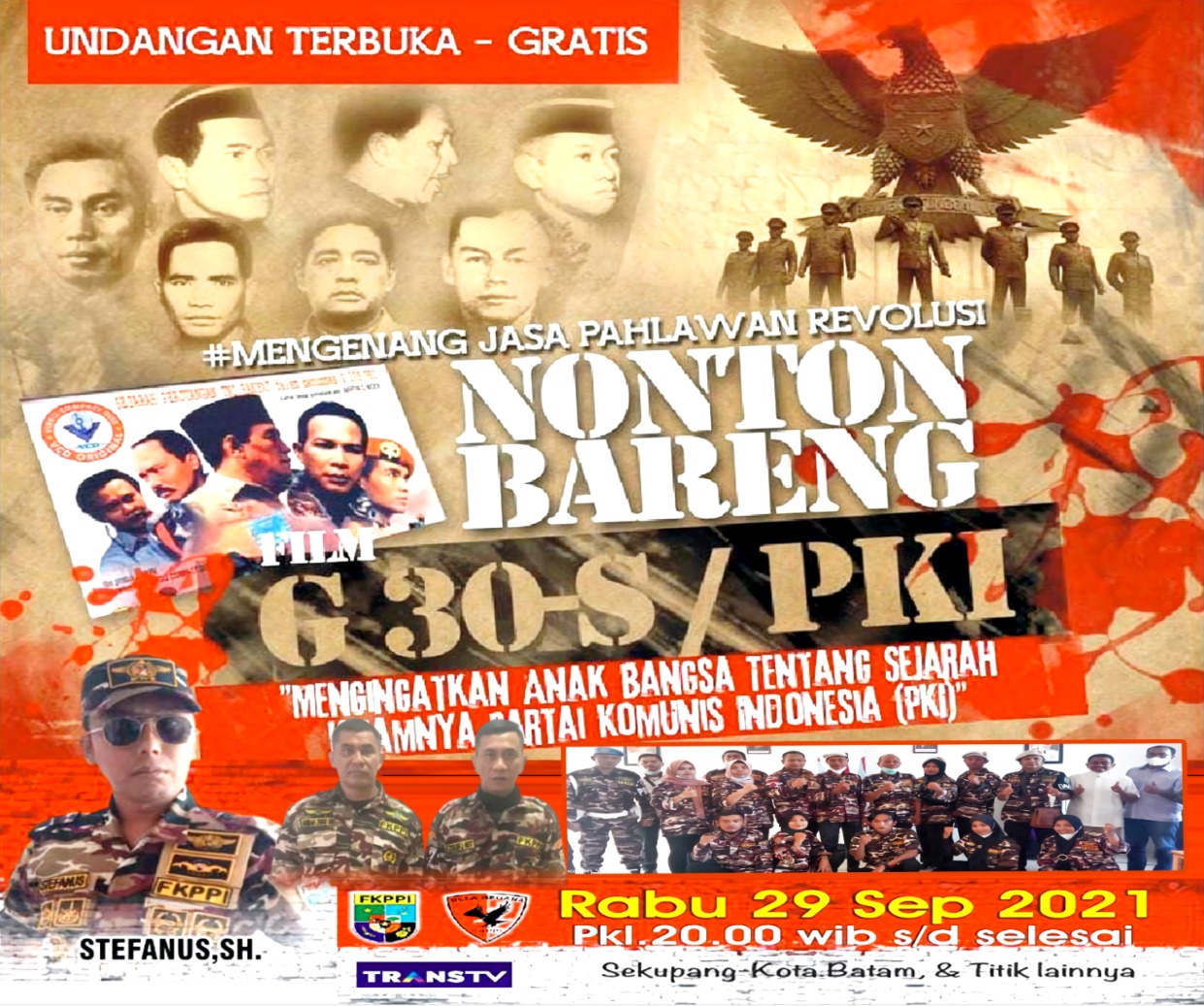 Nobar Film sejarah penumpasan G30S PKI ini merupakan Ide dari dewan penasehat FKPPI 31030-07 Rayon Sekupang dengan Ketua FKPPI XXXI PC Kota Batam menunjuk Sub Rayon Tanjung Riau bersama Danton Rayon memfasilitasi acara tersebut, Provost bersama Babinkamtibmas dan Babinsa hadir disana mengawasi aturan protokol kesehatan.yang berjalan.