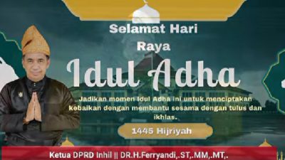 Pada kesempatan ini Saya, Dr.H.Ferryandi ST MM MT, Ketua DPRD serta segenap anggota DPRD kabupaten Indragiri Hilir mengucapkan ” Selamat Hari Raya Idul Adha 1445 H”. Mohon Maaf Zahir dan Batin.