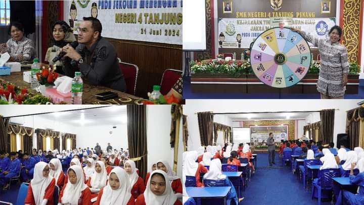 TANJUNGPINANG – lancangkuningnews.com : Dalam rangka pembentukan Revolusi Mental Karakter Anak Bangsa di Bidang Pendidikan untuk mewujudkan peningkatan kesadaran hukum dalam masyarakat khususnya dibidang Pendidikan, Kejaksaan Tinggi Kepulauan Riau melalui Program Pembinaan Masyarakat Taat Hukum (BINMATKUM) pada kegiatan Penyuluhan Hukum Jaksa Masuk Sekolah (JMS) menyelenggarakan kegiatan Program Jaksa Masuk Sekolah di SMK Negeri 4 Tanjungpinang dan SMA Negeri 4 Tanjungpinang dengan mengangkat tema “Pencegahan Penyalahgunaan dan Peredaran Narkotika serta Perundungan (Bullying)”, dimana Tim JMS yang dihadiri oleh Kasi Penerangan Hukum Denny Anteng Prakoso, SH., MH., dan Kasi Teknologi Informasi dan Produksi Intelijen M. Chadafi Nasution, SH., MH., Jumat (21/06/2023).