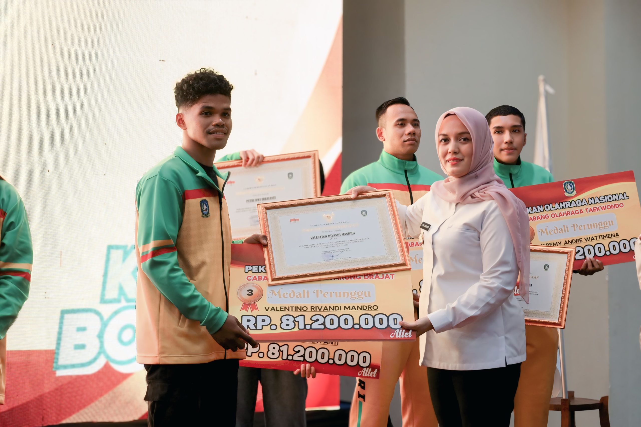 Wakil Bupati Bintan Deby Maryanti, menyerahan bonus kepada para atlet dan pelatih peraih medali pada Pekan Olahraga Nasional (PON) XXI Aceh-Sumut tahun 2024 lalu.