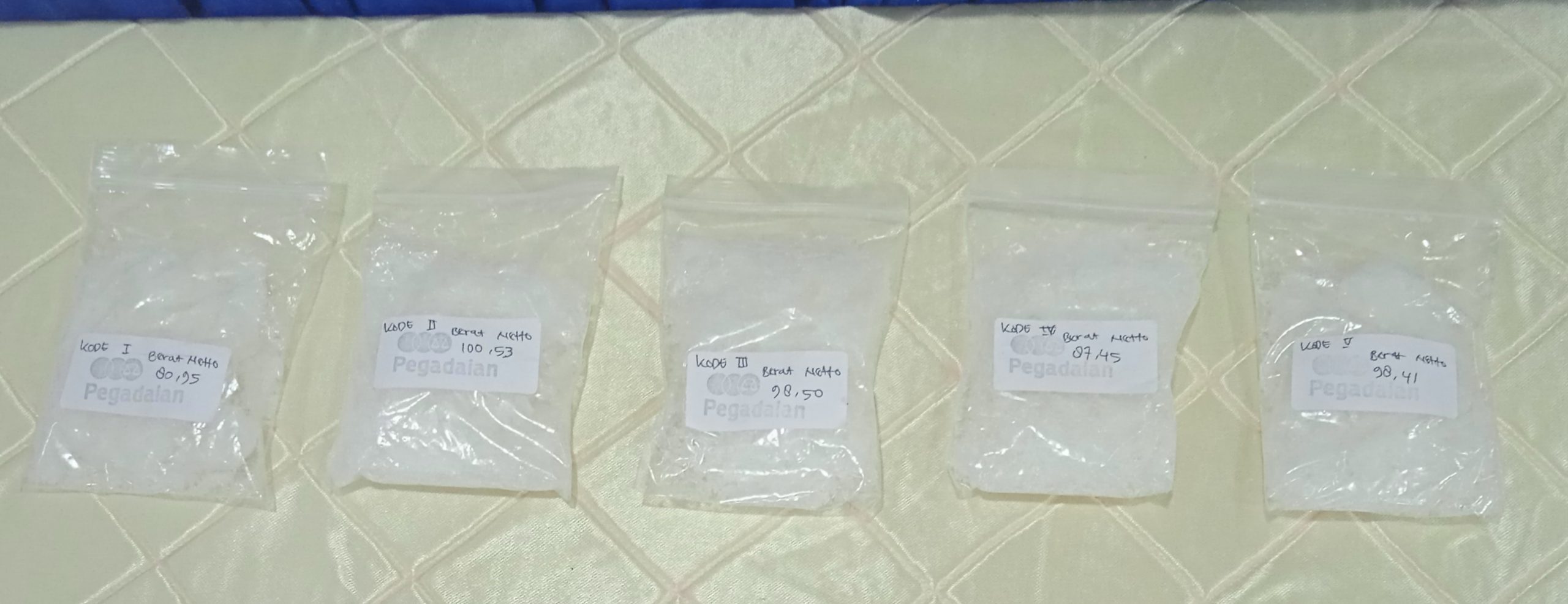Selanjutnya, MKR diminta untuk melepaskan pakaiannya dan ditemukan lima bungkus pelastik bening berisi kristal putih yang disembunyikan di dalam celana dalamnya. Selanjutnya, hasil pemeriksaan total berat bruto barang tersebut mencapai 496 gram diduga merupakan Narkotika Golongan I jenis Methamphetamine (Sabu).