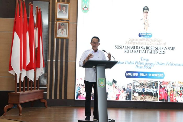 BATAM — Wali Kota Batam Amsakar Achmad secara resmi membuka Sosialisasi Dana Bantuan Operasional Satuan Pendidikan (BOSP) tingkat SD dan SMP Kota Batam Tahun 2025, yang berlangsung di Kantor Wali Kota Batam, Rabu (15/10/2025). Kegiatan ini mengusung tema “Pencegahan Tindak Pidana Korupsi dalam Pelaksanaan Dana BOSP” dan dihadiri para kepala sekolah serta pengelola dana pendidikan di lingkungan Pemerintah Kota Batam.