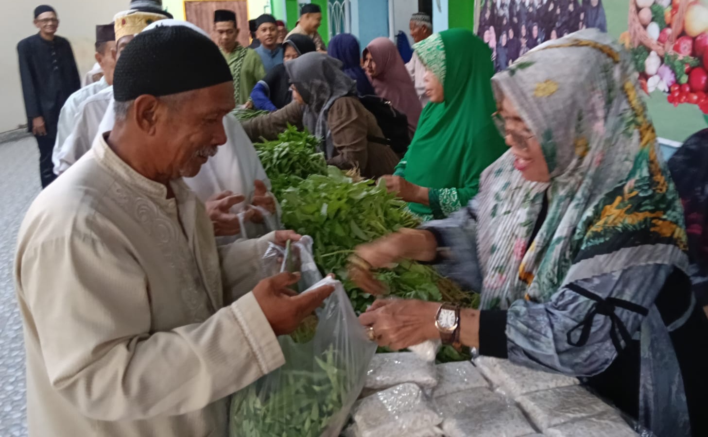 Kita beli sayur mayur dari petani, lalu kita kemas bersama dan bagikan gratis kepada jamaah di Kota Tanjungpinang. Semboyan kita sederhana: membantu petani di kebun, meringankan jamaah di kota,” jelasnya.