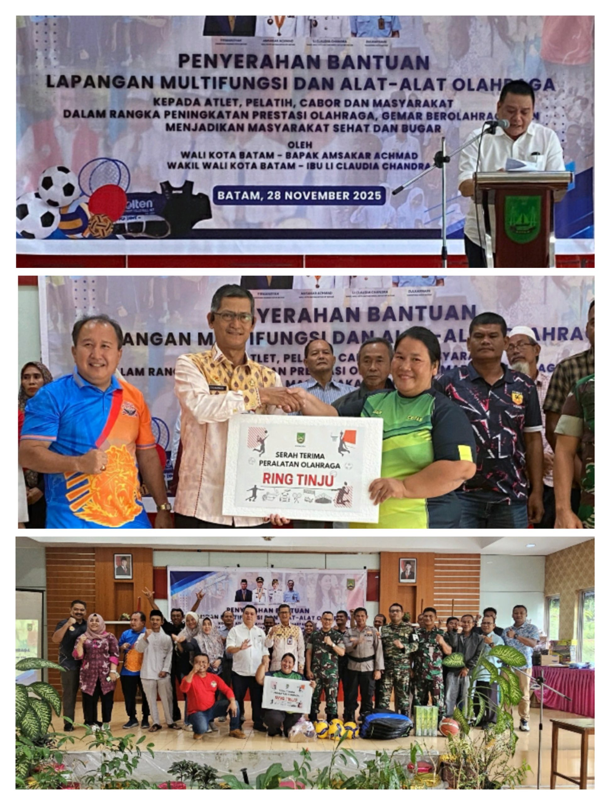 Batam, Lancangkuningnews.com — Pemerintah Kota Batam kembali menunjukkan komitmennya dalam meningkatkan kualitas sarana olahraga melalui penyerahan bantuan lapangan multifungsi dan ribuan alat olahraga kepada atlet, pelatih, cabang olahraga (cabor), dan masyarakat. Penyerahan berlangsung di Aula Kantor Dispora Batam pada Jumat (28/11/2025).