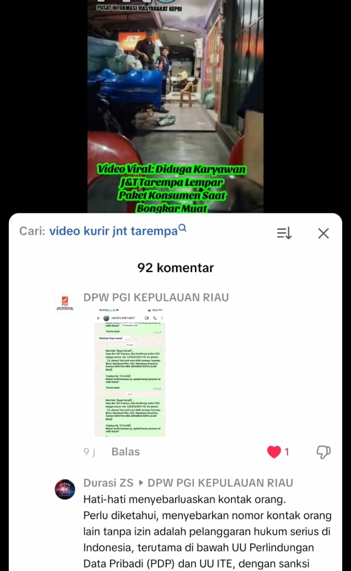Seorang kurir J&T diduga menyebarluaskan tangkapan layar percakapan dengan seorang konsumen melalui kolom komentar di platform TikTok. Percakapan tersebut diunggah menggunakan akun bernama DPW PGI Kepulauan Riau.
